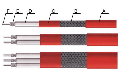 串聯恒功率電伴熱帶也由五個部分組成:1、鍍錫銅絞線 2、芯線絕緣護套 3、內護套 4、編織層 5、外護套 。
