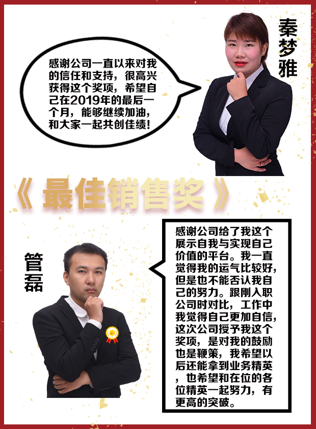 全體員工合唱普天之歌,拉開此次表彰大會序幕。岳總經理向業務一部秦夢雅和業務二部管磊表示祝賀及感謝,兩位業務精英也發表了自己的獲獎感言。