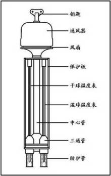 通風干濕表的測濕原理和百葉箱干濕表相同,其感應部件為兩支型號完全一樣的溫度表,一支為干球,另一支為濕球,濕球的感應球部包著紗布,觀測時須濕潤濕球紗布。