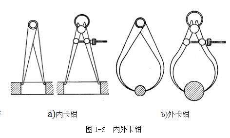 圖1-3是常見的兩種內(nèi)外卡鉗。內(nèi)外卡鉗是最簡單的比較量具。外卡鉗是用來測量外徑和平面的,內(nèi)卡鉗是用來測量內(nèi)徑和凹槽的。它們本身都不能直接讀出測量結(jié)果,而是把測量得的長度尺寸 (直徑也屬于長度尺寸),在鋼直尺上進行讀數(shù),或在鋼直尺上先取下所需尺寸,再去檢驗零件的直徑是否符合。