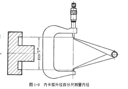 也能分辨得出。又如用內(nèi)卡鉗與外徑百分尺聯(lián)合測量內(nèi)孔尺寸時,有經(jīng)驗的老師傅完全有把握用這種方法測量高精度的內(nèi)孔。這種內(nèi)徑測量方法,稱為“內(nèi)卡搭百分尺”,是利用內(nèi)卡鉗在外徑百分尺上讀取準確的尺寸,如圖1-9所示,再去測量零件的內(nèi)徑;或內(nèi)卡在孔內(nèi)調(diào)整好與孔接觸的松緊程度,再在外徑百分尺上讀出具體尺寸。這種測量方法,不僅在缺少精密的內(nèi)徑量具時,是測量內(nèi)徑的好辦法,而且,對于某零件的內(nèi)徑,如圖1-9所示的零件,由于它的孔內(nèi)有軸而使用精密的內(nèi)徑量具有困難,則應用內(nèi)卡鉗搭外徑百分尺測量內(nèi)徑方法,就能解決問題。