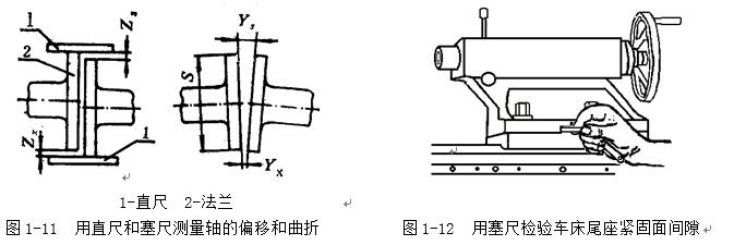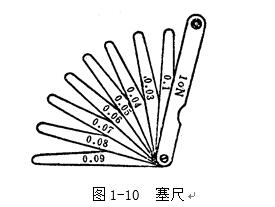 塞尺又稱厚薄規(guī)或間隙片。主要用來檢驗機(jī)床特別緊固面和緊固面、活塞與氣缸、活塞環(huán)槽和活塞環(huán)、十字頭滑板和導(dǎo)板、進(jìn)排氣閥頂端和搖臂、齒輪嚙合間隙等兩個結(jié)合面之間的間隙大小。塞尺是由許多層厚薄不一的薄鋼片組成(圖1-10)按照塞尺的組別制成一把一把的塞尺,每把塞尺中的每片具有兩個平行的測量平面,且都有厚度標(biāo)記,以供組合使用。