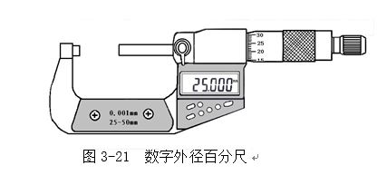 近來,我國有數字外徑百分尺(圖3-21),用數字表示讀數,使用更為方便。還有在固定套筒上刻有游標,利用游標可讀出0.002或0.001mm的讀數值。