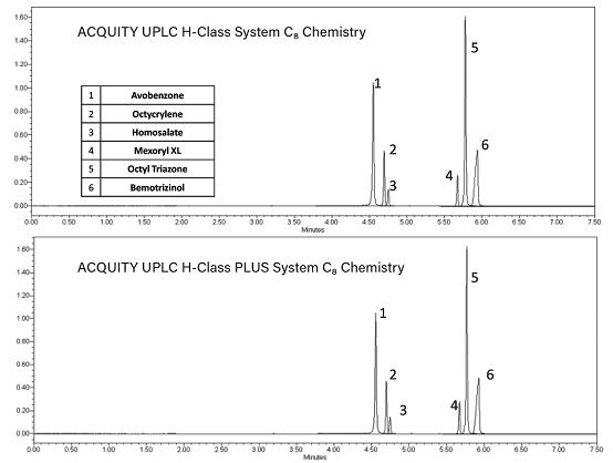 圖1. 分別在ACQUITY UPLC H-Class和ACQUITY UPLC H-Class PLUS系統(tǒng)上使用ACQUITY UPLC BEH C8色譜柱填料分離各種防曬霜活性成分標準品得到的疊加色譜圖。