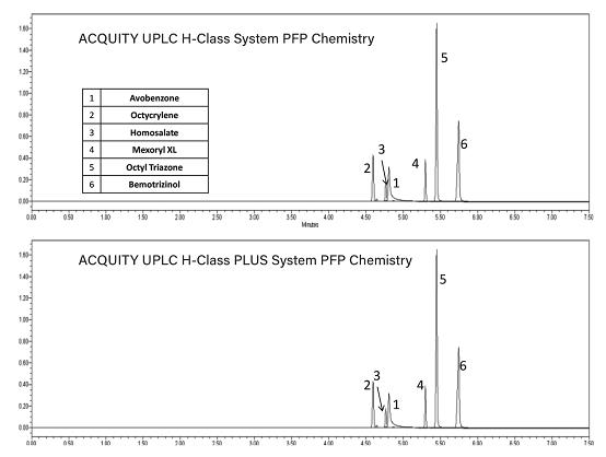 圖2.分別在ACQUITY UPLC H-Class和ACQUITY UPLC H-Class PLUS系統(tǒng)上使用ACQUITY UPLC HSS PFP色譜柱分離各種防曬霜活性成分標準品得到的疊加色譜圖。