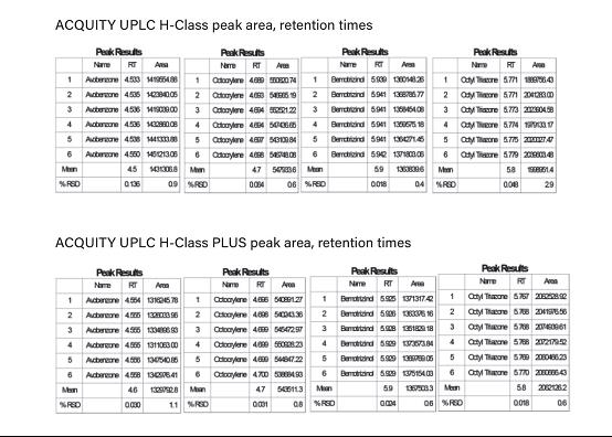圖3. ACQUITY UPLC H-Class和ACQUITY UPLC H-Class PLUS系統(tǒng)的代表性保留時間和峰面積數(shù)據(jù)。