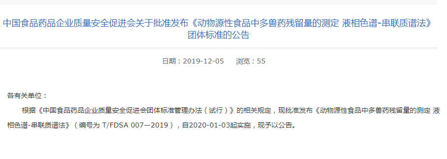 近日,中國食品藥品企業(yè)質(zhì)量安全促進(jìn)會發(fā)布了關(guān)于《動物源性食品中多獸藥殘留量的測定 液相色譜-串聯(lián)質(zhì)譜法》團(tuán)體標(biāo)準(zhǔn)的公告。公告中稱,該標(biāo)準(zhǔn)將于2020年1月3號正式實(shí)施。